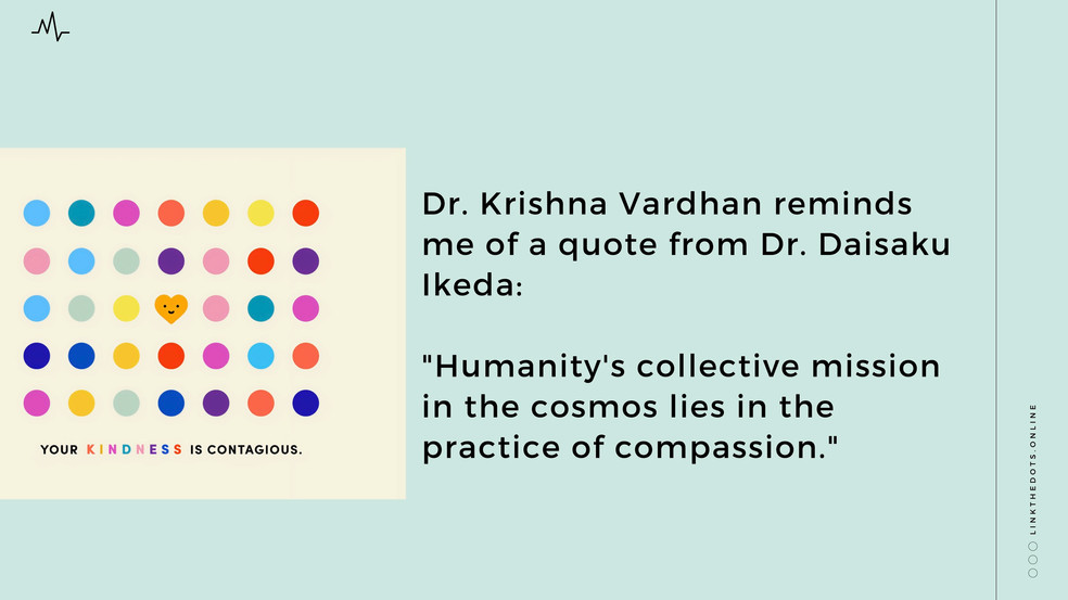 Dr. Krishna Vardhan reminds me of a quote from Dr. Daisaku Ikeda: "Humanity's collective mission in the cosmos lies in the practice of compassion."