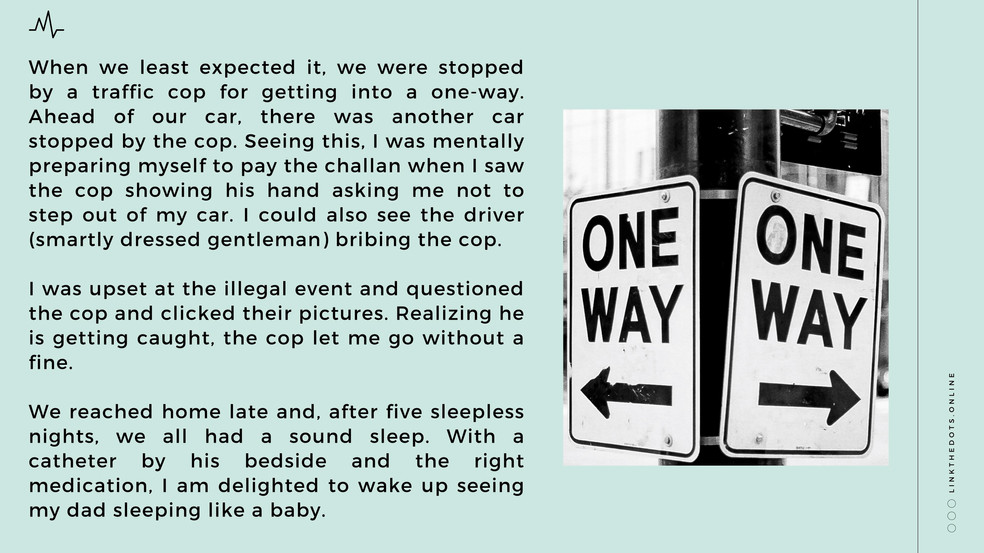 When we least expected it, we were stopped by a traffic cop for getting into a one-way. Ahead of our car, there was another car stopped by the cop. Seeing this, I was mentally preparing myself to pay the challan when I saw the cop showing his hand asking me not to step out of my car. I could also see the driver (smartly dressed gentleman) bribing the cop. I was upset at the illegal event and questioned the cop and clicked their pictures. Realizing he is getting caught, the cop let me go without a fine. We reached home late and, after five sleepless nights, we all had a sound sleep. With a catheter by his bedside and the right medication, I am delighted to wake up seeing my dad sleeping like a baby.