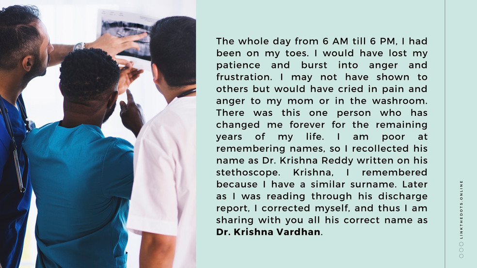 The whole day from 6 AM till 6 PM, I had been on my toes. I would have lost my patience and burst into anger and frustration. I may not have shown to others but would have cried in pain and anger to my mom or in the washroom. There was this one person who has changed me forever for the remaining years of my life. I am poor at remembering names, so I recollected his name as Dr. Krishna Reddy written on his stethoscope. Krishna, I remembered because I have a similar surname. Later as I was reading through his discharge report, I corrected myself, and thus I am sharing with you all his correct name as Dr. Krishna Vardhan.